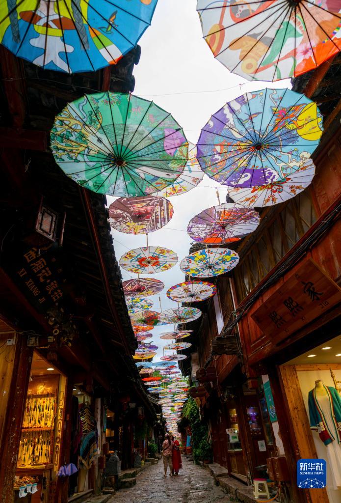 這是2021年8月19日拍攝的麗江古城內(nèi)一條油紙傘裝飾的巷子。新華社記者 陳欣波 攝