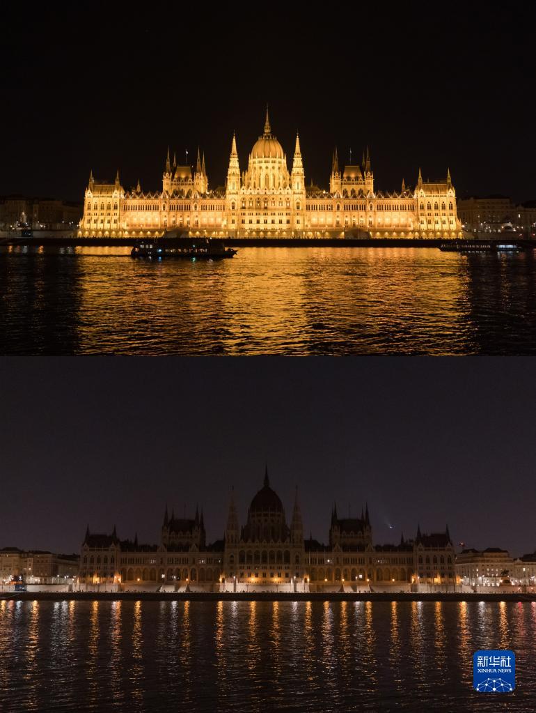 這張拼版照片顯示的是,3月26日,匈牙利布達(dá)佩斯匈牙利國(guó)會(huì)大廈在“地球一小時(shí)”開始前后的景象。