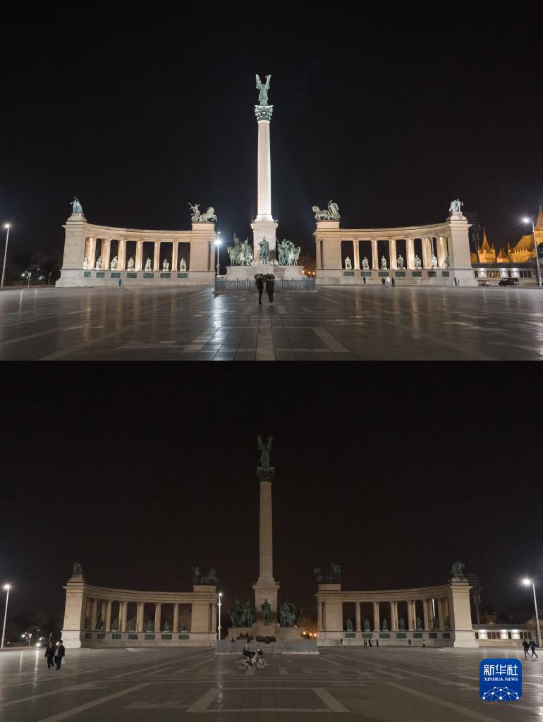 這張拼版照片顯示的是,3月26日,匈牙利布達(dá)佩斯英雄廣場(chǎng)在“地球一小時(shí)”開始前后的景象。