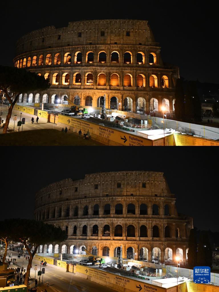 這張拼版照片顯示的是,3月26日,意大利羅馬斗獸場(chǎng)在“地球一小時(shí)”開始前后的景象。