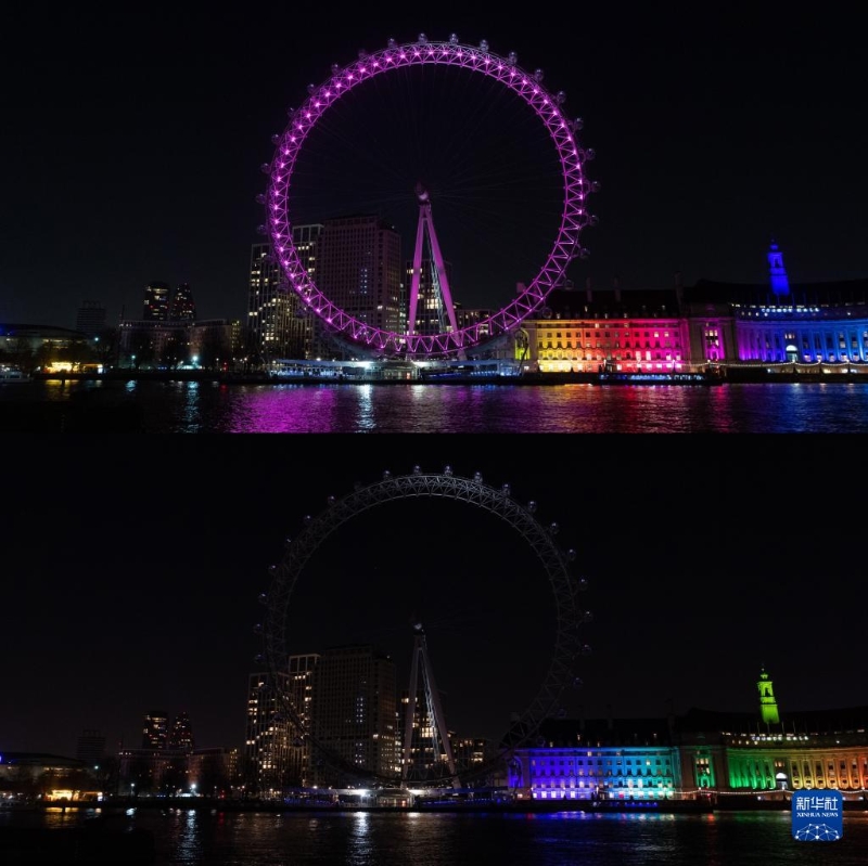 這張拼版照片顯示的是,3月26日,位于英國(guó)倫敦的“倫敦眼”在“地球一小時(shí)”開始前后的景象。