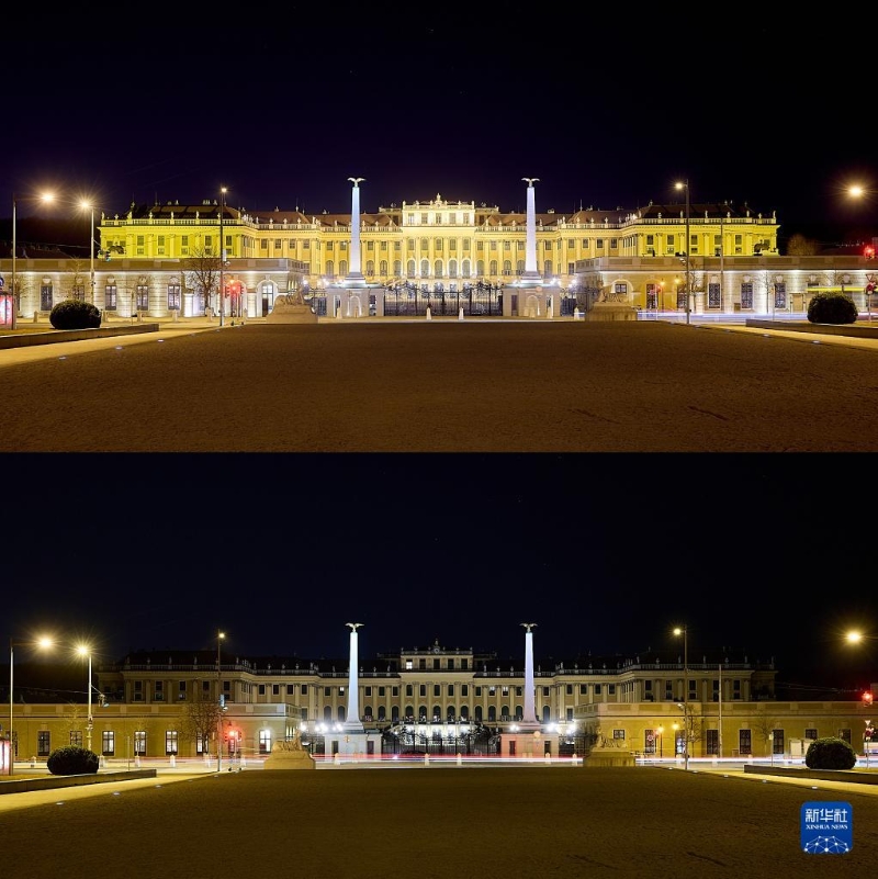 這張拼版照片顯示的是,3月26日,奧地利維也納美泉宮在“地球一小時(shí)”開始前(上)后的景象。