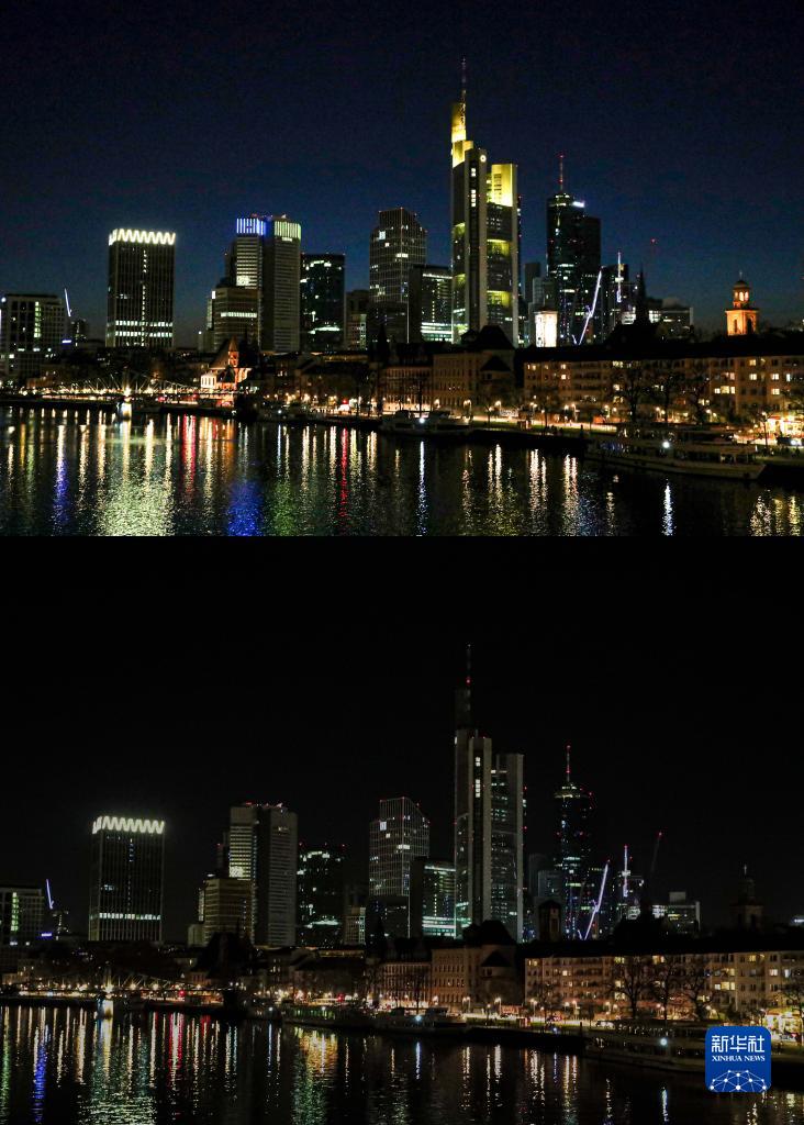 這張拼版照片顯示的是,3月26日,位于德國(guó)法蘭克福的金融區(qū)在“地球一小時(shí)”開始前(上)后的景象。