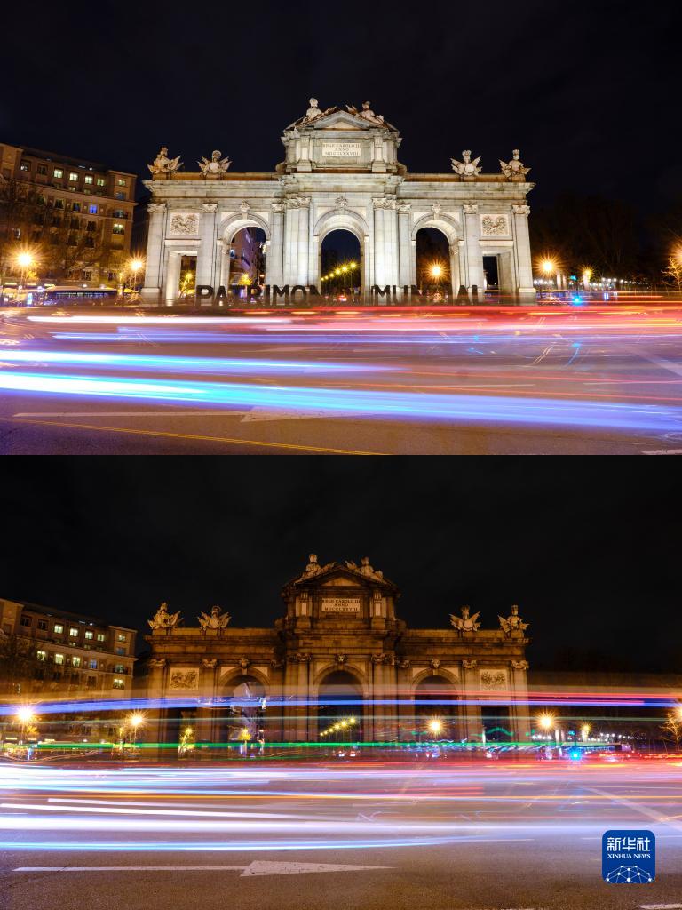 這張拼版照片顯示的是,3月26日,位于西班牙馬德里的阿爾卡拉門在“地球一小時(shí)”開始前(上)后的景象(長(zhǎng)時(shí)間曝光照片)。