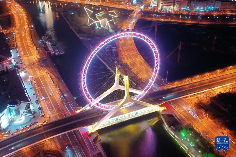 3月28日拍攝的天津永樂橋夜景 (無人機照片)。