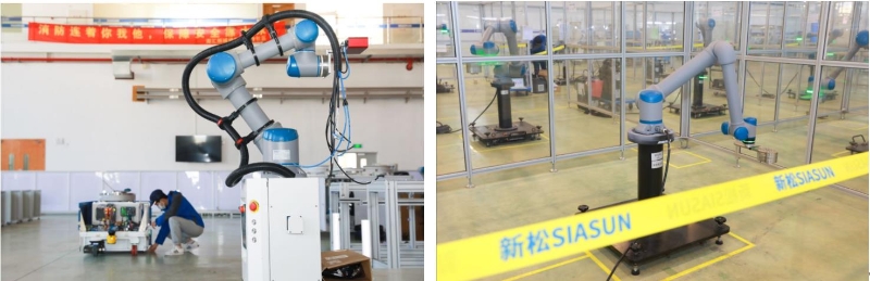 上海疫情封控管理的第一天,中科新松的臨港產(chǎn)業(yè)基地的生產(chǎn)車間內(nèi)一切井然有序,一臺臺多可協(xié)作機(jī)器人正在進(jìn)行出廠前的安裝、測試。生產(chǎn)人員佩戴口罩,認(rèn)真地對即將發(fā)貨的設(shè)備進(jìn)行專業(yè)檢測和記錄。