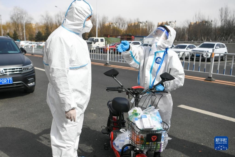 在長春市寬城區(qū),工作人員為居民配送生活用品(4月4日攝)。
