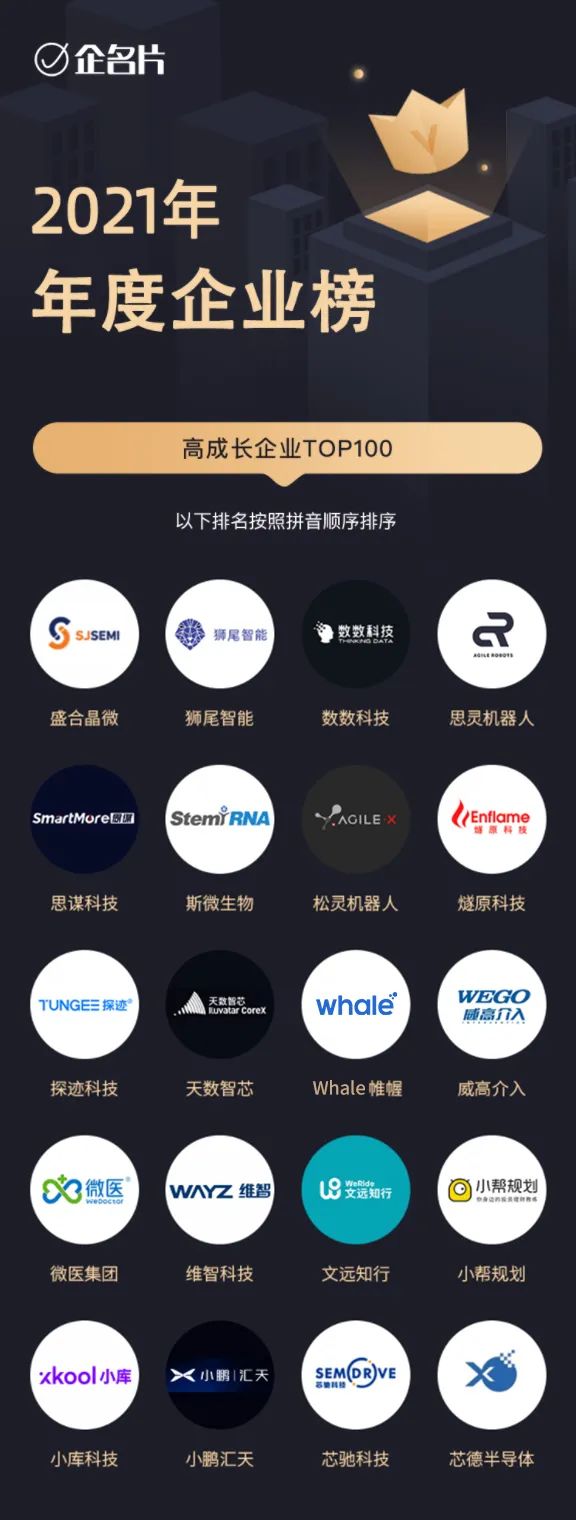 昨日,企名片公布了 2021 年年度企業(yè)榜——高成長企業(yè)TOP100,Whale 帷幄有幸上榜。企名片依托其大數(shù)據優(yōu)勢,已連續(xù) 4 年發(fā)布高成長企業(yè)年度榜單。本次企業(yè)榜單基于國內企業(yè)近三年「市場」、「創(chuàng)新」、「團隊」、「商業(yè)化潛力」四大維度十二項指標進行綜合評定,最后評選出近三年「高成長企業(yè)Top100」。