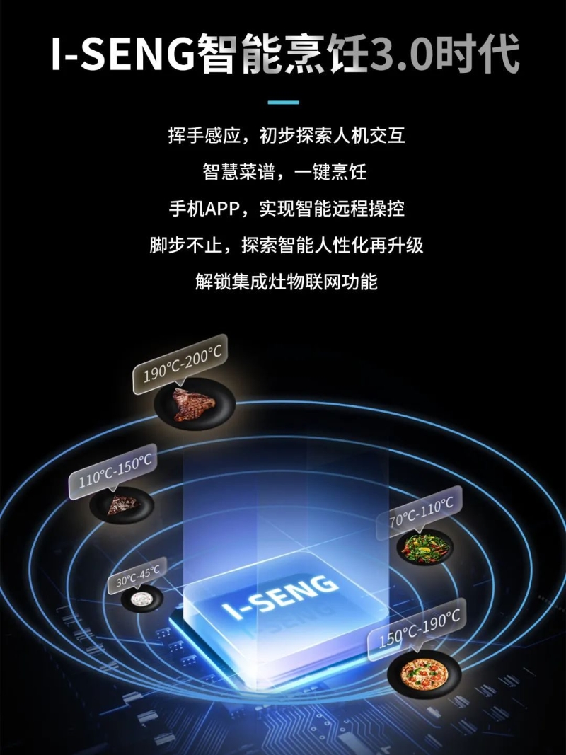 憑借獨有的專業(yè)科研創(chuàng)新能力,森歌集成灶的i-SENG智能烹飪系統(tǒng)經(jīng)過了從1.0到4.0的不斷升級進化。