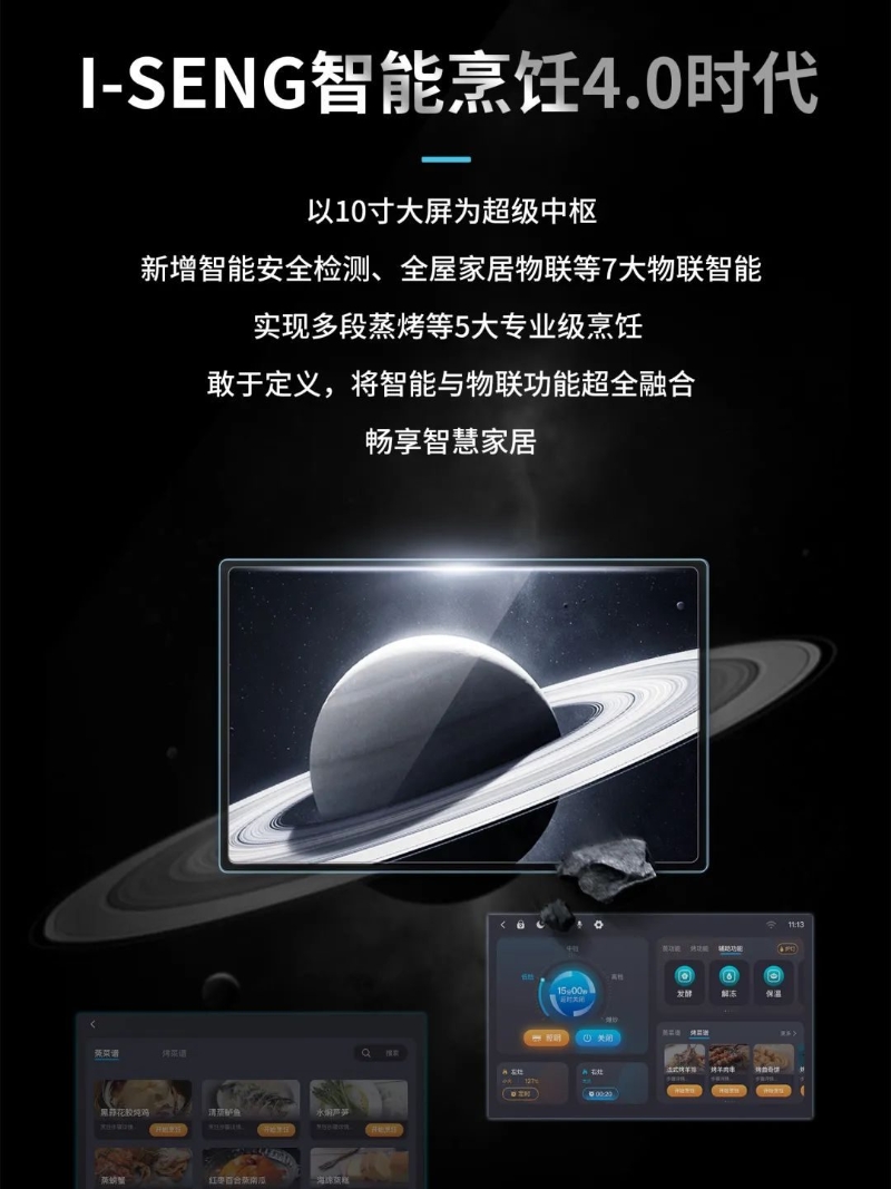 從1.0時代已初步實現(xiàn)LED彩屏控制,基本音樂、娛樂,以及菜譜等功能,在行業(yè)率先嘗試智能集成匹配,成為智能化集成灶的先行者。