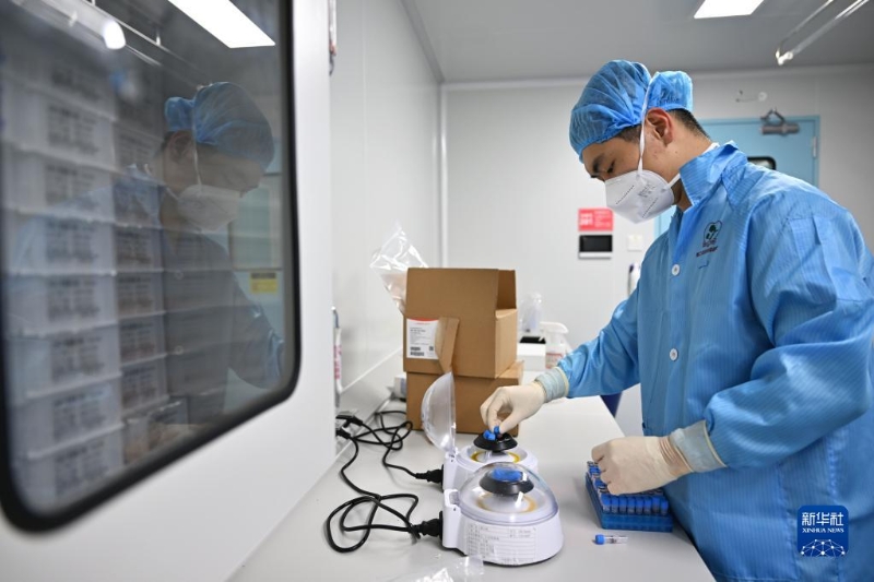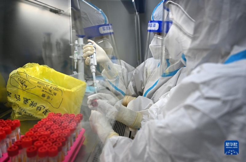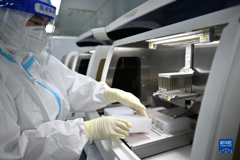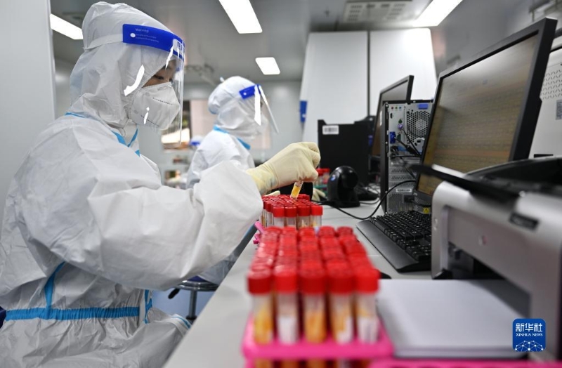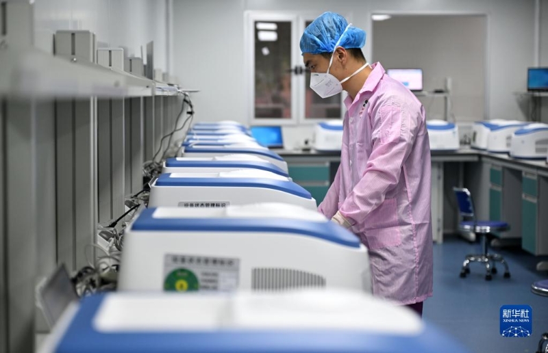 ??谑腥】捣肿俞t(yī)學研究中心(大型核酸檢測實驗室)位于??趪腋咝聟^(qū)美安生態(tài)科技新城,是海口市第一個由政府主導的全員核酸檢測實驗室示范項目,于3月25日正式建成啟用,核酸檢測能力可達每日8萬管。新華社記者 郭程 攝