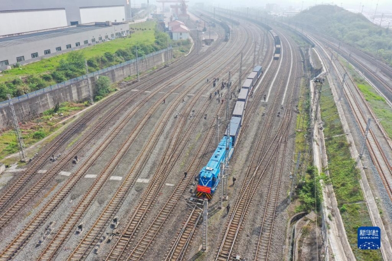 4月7日,長(zhǎng)江—中南半島國(guó)際聯(lián)運(yùn)班列從重慶果園港發(fā)出(無(wú)人機(jī)照片)。