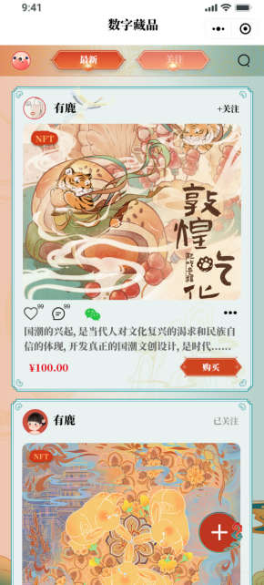 為了配合新時代國潮時尚,促使國潮數(shù)字藏品成為時尚圈流行的焦點,「九色鹿」數(shù)字藝術(shù)平臺應(yīng)運而生?!妇派埂箶?shù)字藝術(shù)平臺是依托區(qū)塊鏈技術(shù),是一個為藝術(shù)家作品打造鏈上唯一存證,結(jié)合元宇宙通過虛擬體驗來優(yōu)化用戶的數(shù)字化生活體驗的數(shù)字藝術(shù)收藏品平臺?!妇派埂辜婢咚囆g(shù)性與收藏性于一體,在保護其數(shù)字版權(quán)的基礎(chǔ)上,實現(xiàn)真實可信的數(shù)字化發(fā)行、購買、收藏和使用,通過沉浸式的元宇宙數(shù)字生活體驗為收藏者和創(chuàng)作者帶來一種全新的交易、創(chuàng)作體驗。