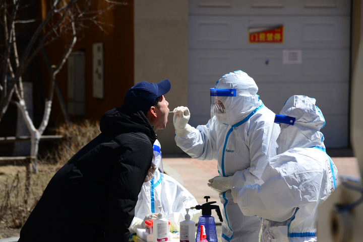 4月7日,在長(zhǎng)春市南關(guān)區(qū)一處核酸檢測(cè)點(diǎn),醫(yī)務(wù)人員為居民進(jìn)行核酸采樣。新華社記者 張建 攝