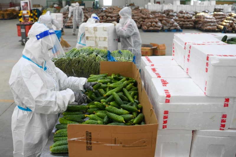 3月27日,在長(zhǎng)春市一蔬菜中轉(zhuǎn)倉(cāng),工作人員清點(diǎn)菜品。新華社發(fā)