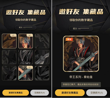 活動(dòng)形式:邀好友收集碎片開啟九宮格合成藏品,用戶每邀請(qǐng)一個(gè)好友注冊(cè)并完成實(shí)名認(rèn)證即可獲得一枚碎片。