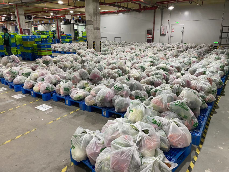 叮咚買菜杭州余杭城市分選中心內(nèi),一批批蔬果等物資正等著運(yùn)往上海。受訪對象供圖