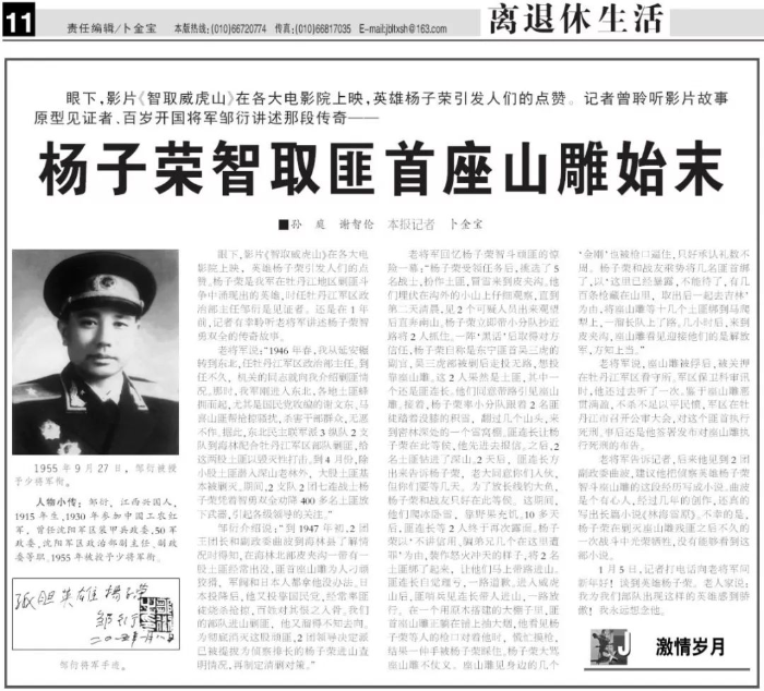 2015年1月14日《解放軍報(bào)》第11版《離退休生活》刊登的《楊子榮智取匪首座山雕始末》。