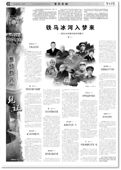 2020年8月1日《解放軍報(bào)》老兵天地版刊登《鐵馬冰河入夢(mèng)來——探訪10位健在的開國(guó)將軍》