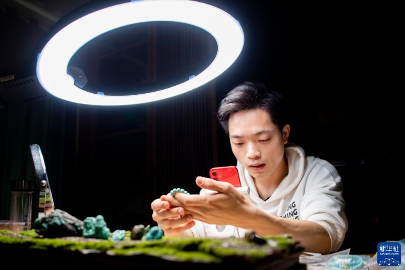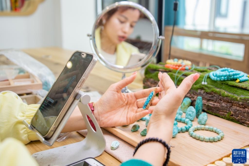 4月13日,在竹山縣綠松石小鎮(zhèn),工作人員在直播銷售綠松石。