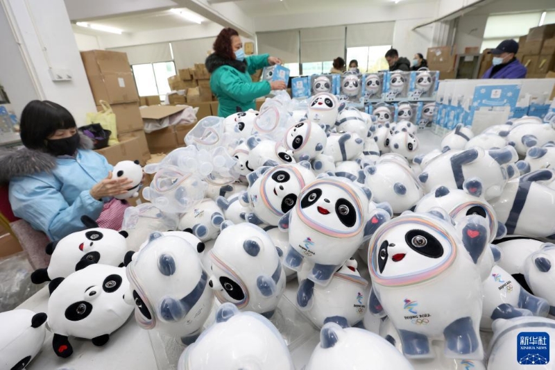 2月8日,工人在位于江蘇省啟東市的一家特許生產(chǎn)商的車(chē)間里包裝“冰墩墩”。新華社發(fā)(許叢軍 攝)