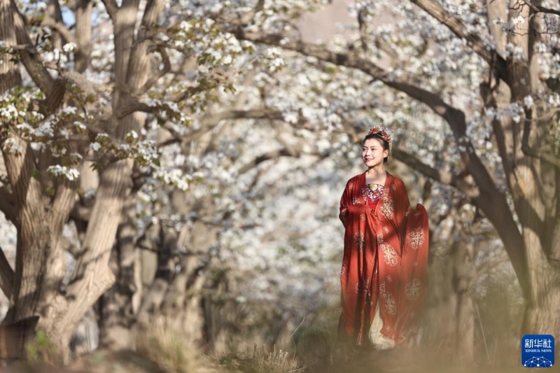 4月7日,景區(qū)工作人員在甘肅省蘭州市皋蘭縣什川鎮(zhèn)百年梨園內(nèi)進(jìn)行表演。受疫情影響,景區(qū)組織工作人員在梨園內(nèi)直播,邀請(qǐng)人們“云賞花”,滿足公眾賞花需求。新華社記者
