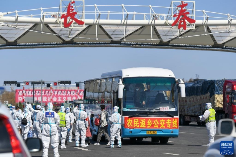 在吉林長(zhǎng)春高速公路東出口,返鄉(xiāng)農(nóng)民登上返鄉(xiāng)公交專(zhuān)線(4月12日攝)。新華社發(fā)