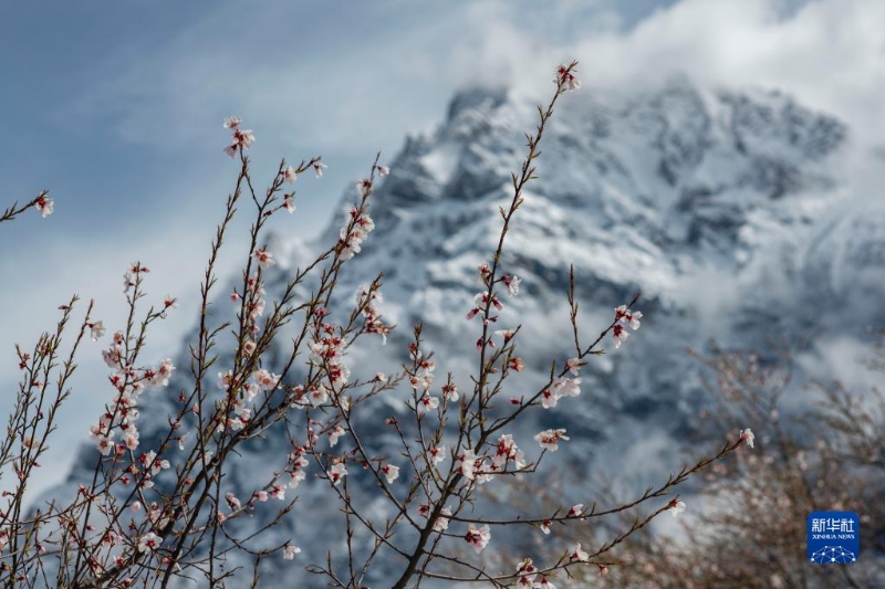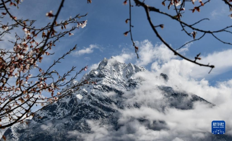 這是在波密縣拍攝的桃花掩映下的雪山(4月18日攝)。