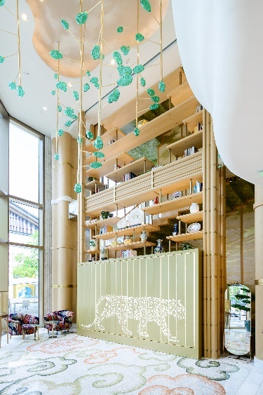 精品店以香檳金色調(diào)為主旋律打造室內(nèi)空間,從本地文化中獲取的設(shè)計(jì)元素比比皆是。精品店門廳 高聳入頂?shù)闹裰茣芮?,映襯翠竹的祖母綠色裝飾吊燈高懸而下,地毯上的彩色祥云圖案如晚霞般絢麗迷人。標(biāo)志作品區(qū) 中央墻面是盤臥巴蜀山巒之間的卡地亞獵豹,精湛的細(xì)木鑲嵌工藝呈現(xiàn)浮雕式的立體效果。區(qū)域兩端的圓形立柱從卡地亞典藏系列的一件香煙盒得到啟發(fā),并加以團(tuán)壽紋這一傳統(tǒng)吉祥圖案作為點(diǎn)綴。女士腕表區(qū)內(nèi), 全手工制作壓花皮革祥云圖與形態(tài)各異的仿中式燈籠吊燈相映,而男士作品區(qū) 則從中式古典園林中獲取靈感,蟠曲造型的松樹與輕逸出塵的竹子彰顯高雅風(fēng)韻。走進(jìn)婚禮作品區(qū), 迎面可見一面現(xiàn)代風(fēng)格手工刺繡屏風(fēng),其上圖案為成都市樹銀杏的葉片形狀,為這一區(qū)域注入摩登美感。VIP沙龍 從香檳色系逐漸過渡至優(yōu)雅的綠色,銀杏葉形落地?zé)舫蔀辄c(diǎn)睛之筆。