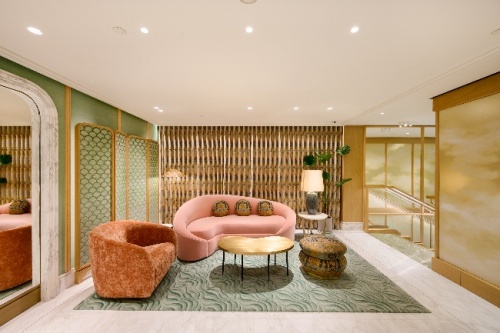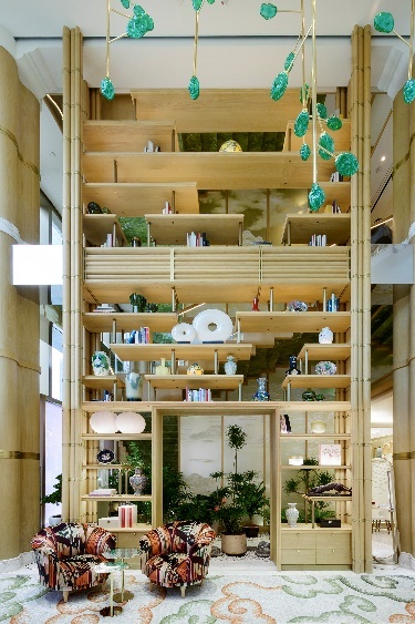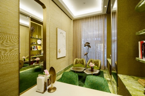 頂層空間旨在為顧客提供個(gè)性化定制服務(wù),整體空間運(yùn)用色彩繽紛的織物打造賓至如歸的舒適感。售后服務(wù)中心 以綠色為主色調(diào),墻邊的銀杏葉組合圖案屏風(fēng)由特別的蛋殼細(xì)工鑲嵌而成。VIP沙龍 從18世紀(jì)法國傳統(tǒng)室內(nèi)設(shè)計(jì)汲取靈感,竹藝框架鑲嵌固定中式壁紙圖案,彰顯中西兼具的古典美感。