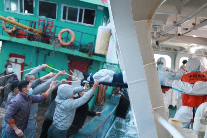 秀山艦經(jīng)一小時(shí)高速航行,抵達(dá)求助漁船所在海域。與求助漁船溝通后,秀山艦決定采取“小船靠大船”和“索橋轉(zhuǎn)運(yùn)”的方法進(jìn)行過駁。幾經(jīng)努力,海警執(zhí)法員和漁船漁民齊心協(xié)力將受傷漁民過駁至海警秀山艦。