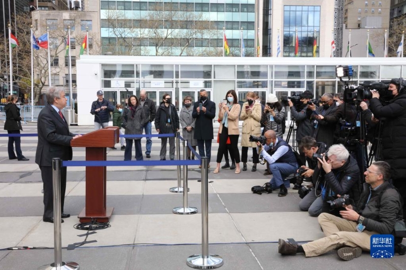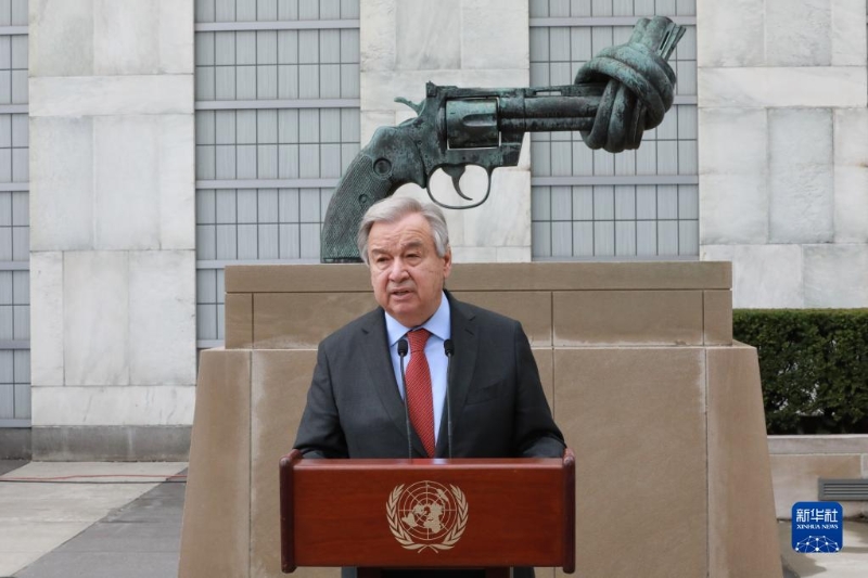 4月19日,聯(lián)合國(guó)秘書(shū)長(zhǎng)古特雷斯在紐約聯(lián)合國(guó)總部標(biāo)志性雕塑“打結(jié)的手槍”前對(duì)記者發(fā)表談話(huà)。新華社記者 謝鍔 攝