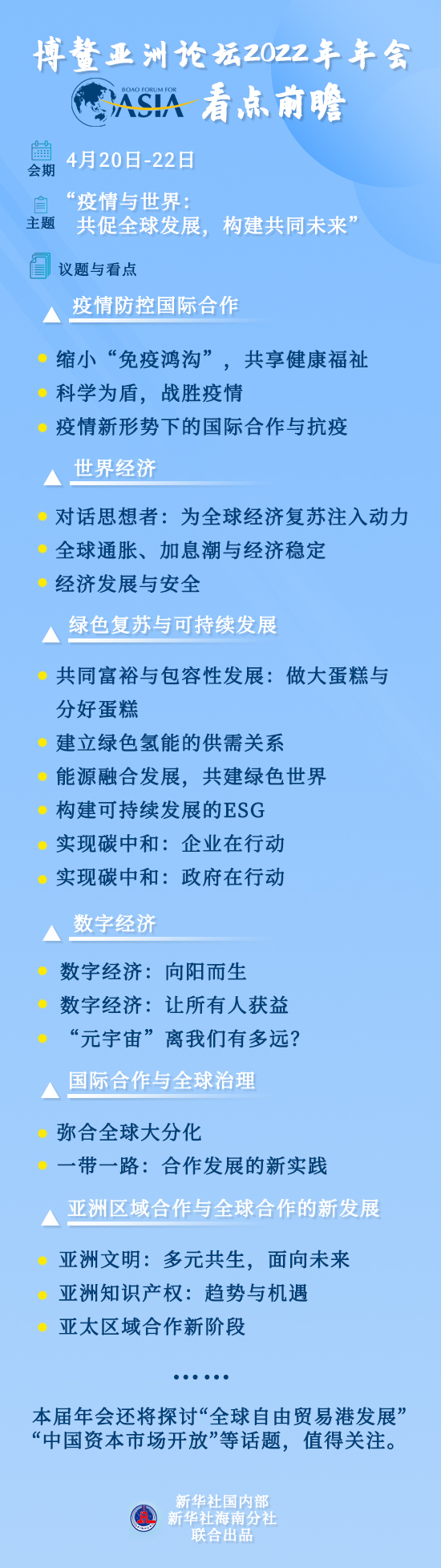 博鰲亞洲論壇2022年年會于4月20日至22日在海南博鰲舉行。當(dāng)前,百年變局和世紀(jì)疫情交織疊加,世界進(jìn)入新的動蕩變革期。本屆論壇年會將舉行30多場分論壇和活動,議題討論集中在六個方面,呼應(yīng)有關(guān)各方的關(guān)切和訴求,其中有哪些看點(diǎn)?看圖了解?! ?/p>
