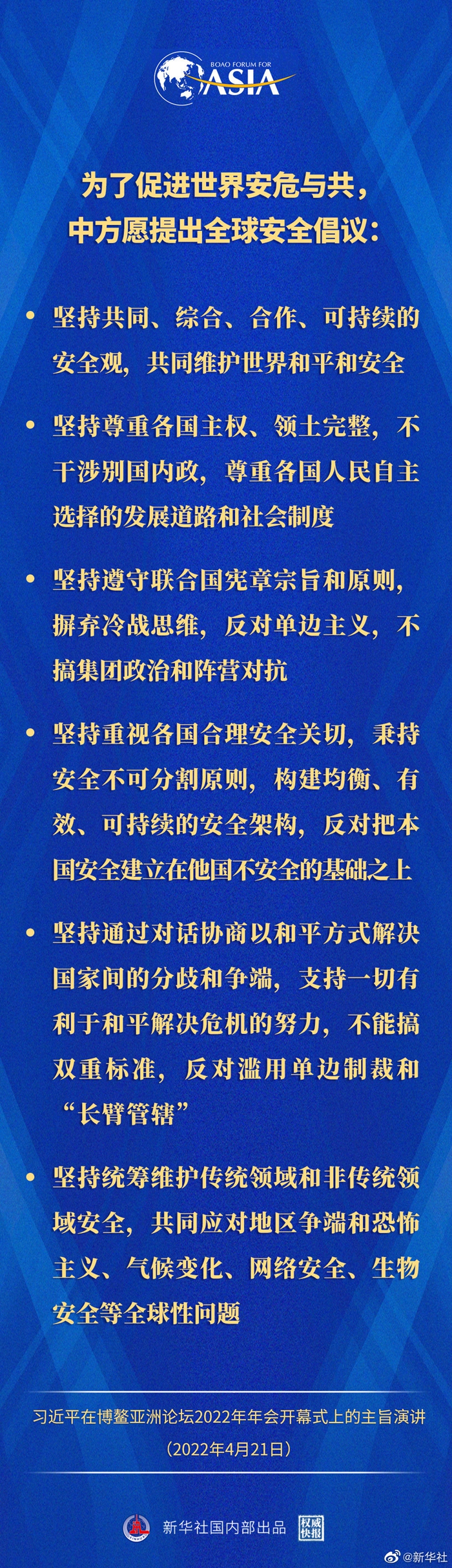 習(xí)近平指出,為了促進世界安危與共,中方愿提出全球安全倡議:要堅持共同、綜合、合作、可持續(xù)的安全觀,共同維護世界和平和安全;堅持尊重各國主權(quán)、領(lǐng)土完整,不干涉別國內(nèi)政,尊重各國人民自主選擇的發(fā)展道路和社會制度;堅持遵守聯(lián)合國憲章宗旨和原則,摒棄冷戰(zhàn)思維,反對單邊主義,不搞集團政治和陣營對抗;堅持重視各國合理安全關(guān)切,秉持安全不可分割原則,構(gòu)建均衡、有效、可持續(xù)的安全架構(gòu),反對把本國安全建立在他國不安全的基礎(chǔ)之上;堅持通過對話協(xié)商以和平方式解決國家間的分歧和爭端,支持一切有利于和平解決危機的努力,不能搞雙重標準,反對濫用單邊制裁和“長臂管轄”;堅持統(tǒng)籌維護傳統(tǒng)領(lǐng)域和非傳統(tǒng)領(lǐng)域安全,共同應(yīng)對地區(qū)爭端和恐怖主義、氣候變化、網(wǎng)絡(luò)安全、生物安全等全球性問題?! ?/p>