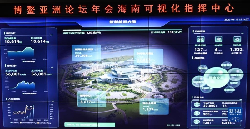 博鰲亞洲論壇年會(huì)海南可視化指揮中心設(shè)立專門的數(shù)字化綠色低碳模塊,該數(shù)字化模塊采用由金風(fēng)科技提供的“智慧能源大腦”平臺(tái),通過數(shù)字化手段清晰統(tǒng)計(jì)大會(huì)各項(xiàng)綠色降碳指標(biāo),為大會(huì)裝上低碳“引擎”(4月19日攝)。