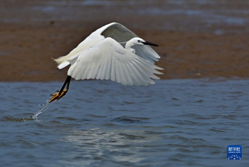 一只白鷺在濕地里飛翔(4月21日攝)。