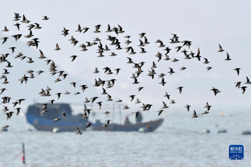 在閩江河口濕地,天空中的鳥群與遠(yuǎn)處作業(yè)的漁船相映成畫(4月10日攝)?! ?/p>