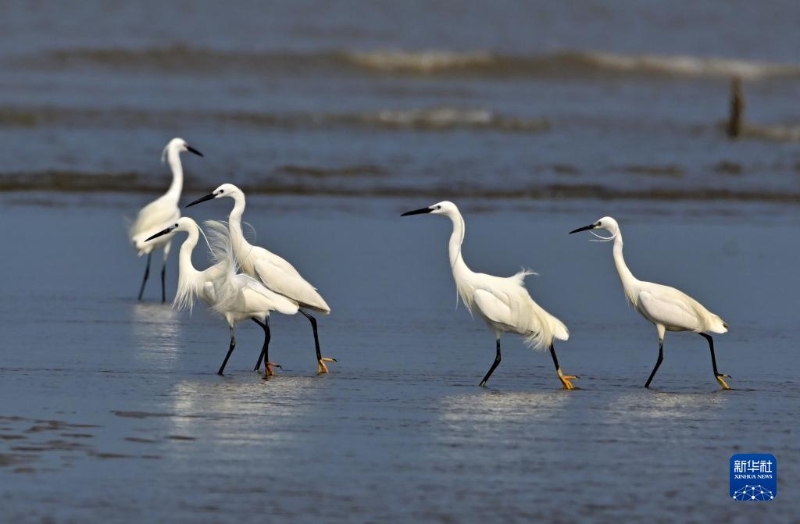 4月21日,在閩江河口濕地里,幾只白鷺在覓食。