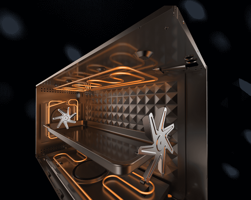 另一方面,凱度第一次將其行業(yè)首創(chuàng)的雙熱風(fēng)技術(shù)植入到集成灶中,全新凱度蒸烤集成中心的蒸烤組件通過(guò)將背部的離心風(fēng)機(jī)從一個(gè)升級(jí)為兩個(gè),并且分別以順時(shí)針、逆時(shí)針雙向旋轉(zhuǎn),再搭配背板的黃金熱風(fēng)孔、專業(yè)四組烤管等,形成一套完善均衡的全驅(qū)熱力系統(tǒng),有效克服了市面上其他蒸烤類(lèi)集成灶控溫不準(zhǔn)、溫場(chǎng)不勻、熱力不足的使用痛點(diǎn)。當(dāng)啟動(dòng)程序后,全新凱度蒸烤集成中心中的蒸烤一體機(jī)將會(huì)迅速形成能量極高、對(duì)流強(qiáng)勁的熱風(fēng),在內(nèi)腔中充分的涌動(dòng)起來(lái),并能有效地觸及內(nèi)腔的各個(gè)角落,使得腔內(nèi)各點(diǎn)的溫度達(dá)到前所未有的均勻,食材能夠360℃均勻受熱,進(jìn)而創(chuàng)造更高效、零失敗的完美體驗(yàn)。