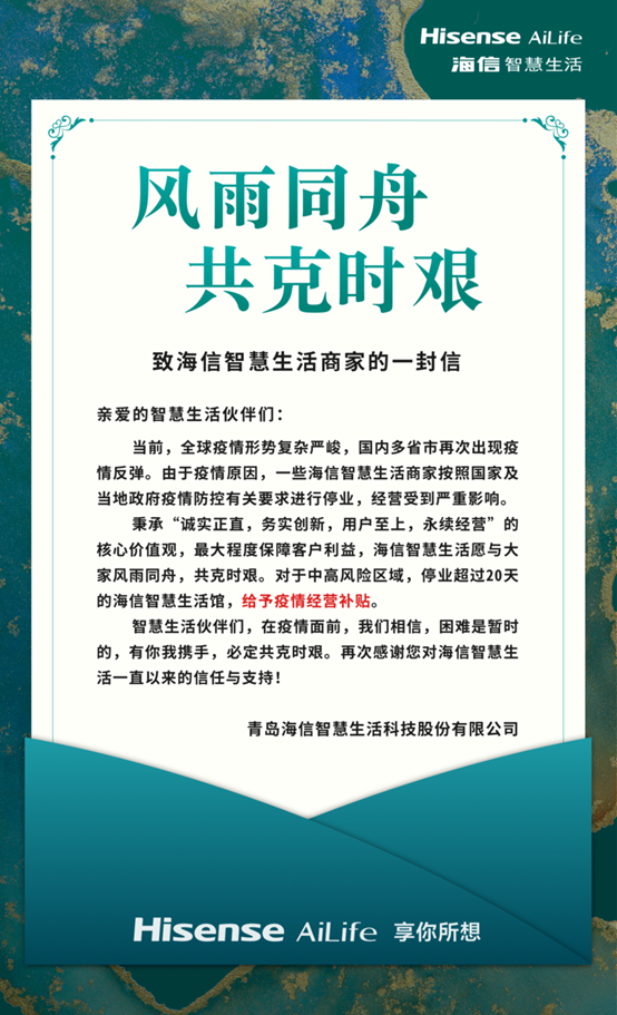 近日,海信智慧生活公司就面向合作商家啟動“風雨同舟共克時艱”疫情互助活動,對處于中高風險區(qū)域且停業(yè)超過20天的海信智慧生活商家給予疫情經(jīng)營補貼。據(jù)了解,2022年以來,海信智慧生活公司在業(yè)務推進過程中了解到,部分合作商家受疫情影響已停業(yè)多日,疊加疫情發(fā)生以來的多重影響,自身運營遭遇嚴峻考驗。本著與商家合作共贏、共渡難關(guān)的初心,智慧生活公司第一時間研究制定了這一方案。