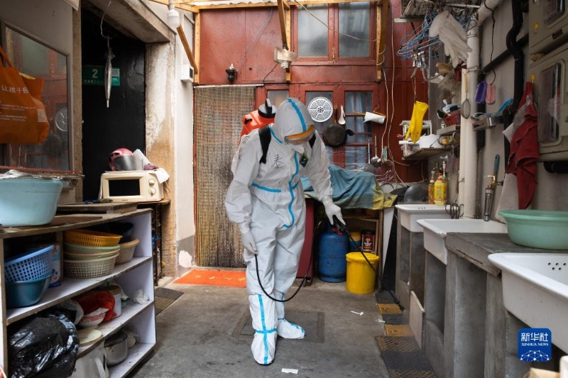 工作人員在黃浦區(qū)豫園街道廣福居民區(qū)消殺通道(4月19日攝)。新華社記者 金立旺 攝