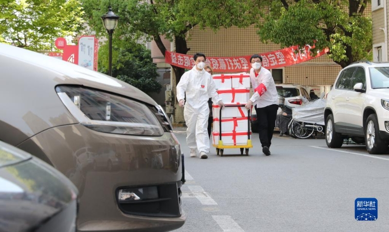在上海市普陀區(qū)錦綠新城,社區(qū)志愿者為居民挨家挨戶運送生活物資(4月11日攝)。新華社記者 陳飛 攝