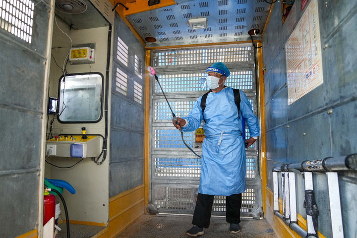 4月24日,中建三局一公司的工作人員在項(xiàng)目施工現(xiàn)場公共區(qū)域進(jìn)行消殺。新華社記者 李博 攝