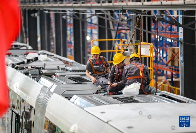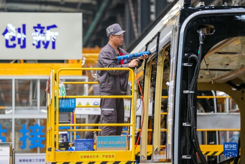 4月24日,在位于四川省宜賓市三江新區(qū)的中車鐵投軌道交通產(chǎn)業(yè)基地生產(chǎn)車間,工人在生產(chǎn)安裝智軌電車(智能軌道快運系統(tǒng))。已有多個國家和地區(qū)就智軌項目進行洽談,希望引進該項目。