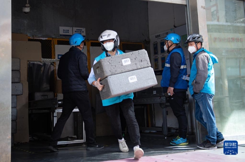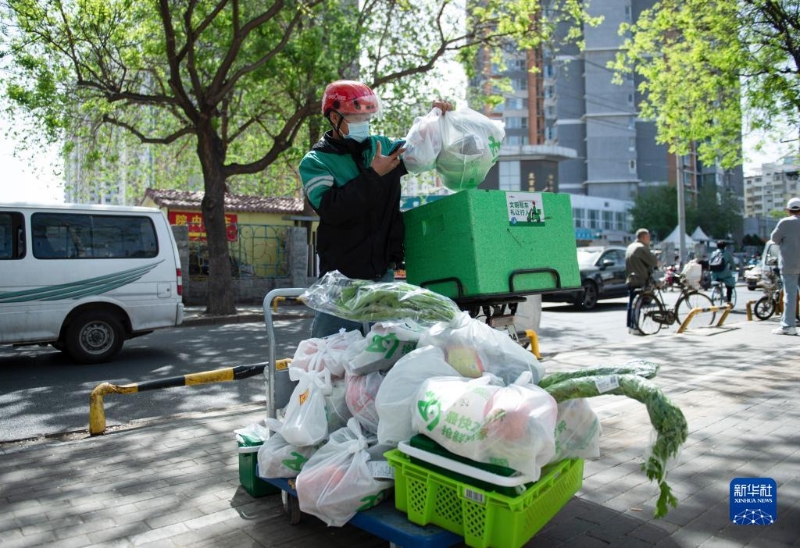 4月26日,在北京市朝陽區(qū),盒馬鮮生配送員取到貨物后送貨。