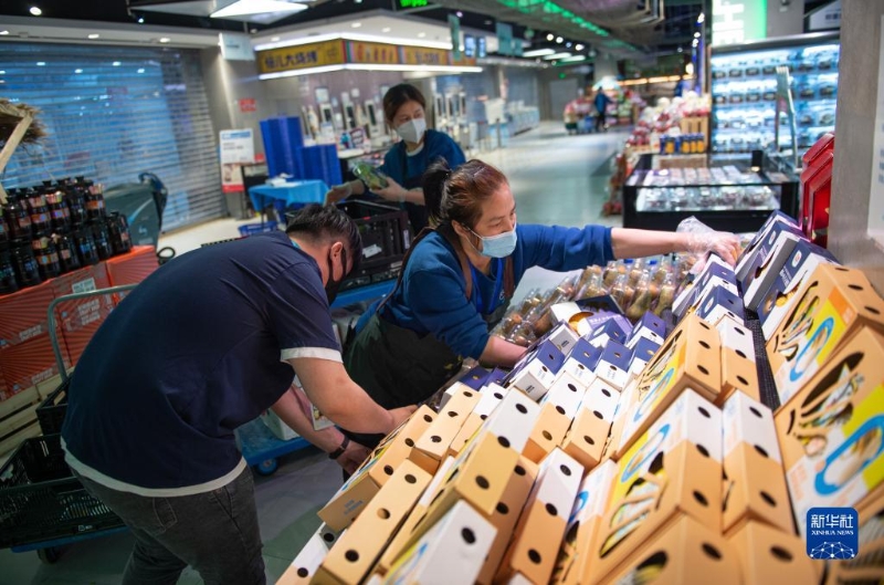 4月26日,在位于北京市朝陽區(qū)十里堡的盒馬鮮生超市,員工在開店?duì)I業(yè)前上貨。