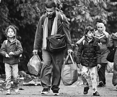 來(lái)自敘利亞等國(guó)的難民在塞爾維亞邊境小村貝爾卡塞沃徒步前行。 圖源:新華社