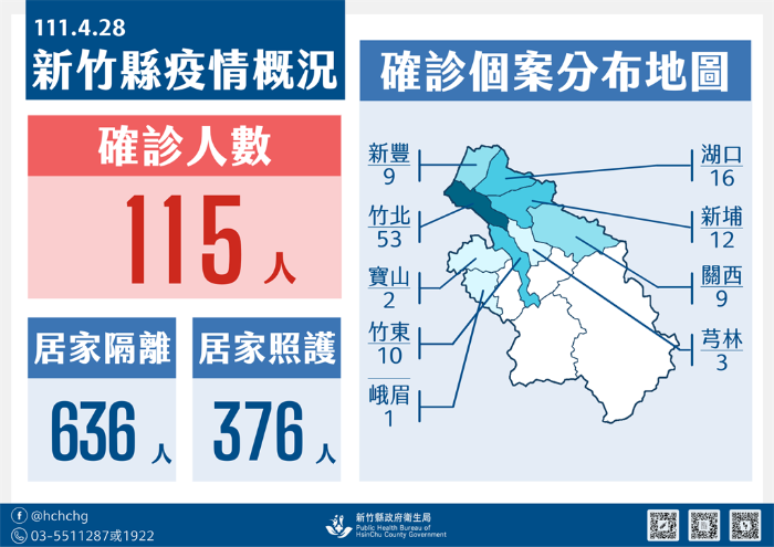 115例的地區(qū)分布為竹北市53例、竹東鎮(zhèn)10例、湖口鄉(xiāng)16例、新豐鄉(xiāng)9例、新埔鎮(zhèn)12例、關西鎮(zhèn)9例、芎林鄉(xiāng)3例、峨眉鄉(xiāng)1例、寶山2例,分別安排就醫(yī)住院、集中檢疫場所治療及申請居家照護方案。