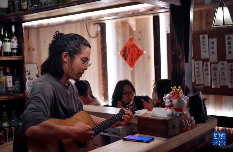 王圣棻在“更也酒肆”里自彈自唱,新穎的經(jīng)營(yíng)方式吸引店鋪周邊的年輕人前來消費(fèi)(5月1日攝)。