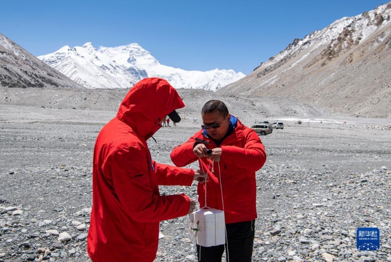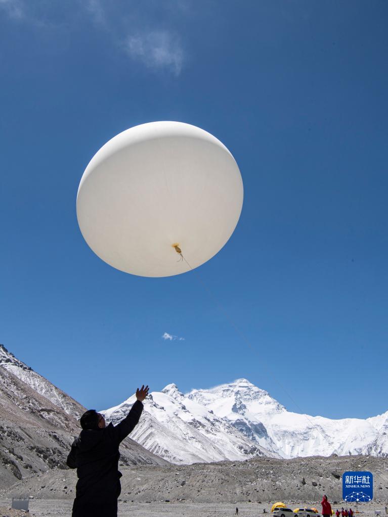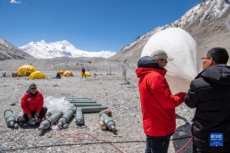 在珠峰登山大本營(yíng),科研人員施放大氣臭氧探空氣球(5月3日攝)。